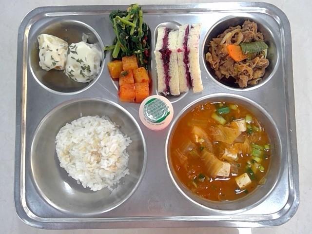 석식 : 현미밥 참치김치찌개 마라불고기 통감자크림소스오븐구이 열무된장무침 깍두기 크림치즈샌드위치 요구르트