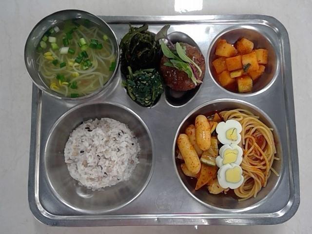 중식 : 혼합잡곡밥 콩나물국 칠리치즈함박스테이크&어린잎채소 치즈떡볶이 다시마채무침 취나물무침 깍두기
