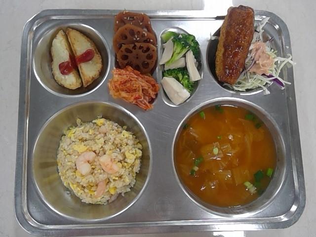 석식 : 계란새우볶음밥 두부된장국 모짜치즈가츠&양배추&소스 수제감자튀김 브로콜리새송이볶음 연근조림 배추김치